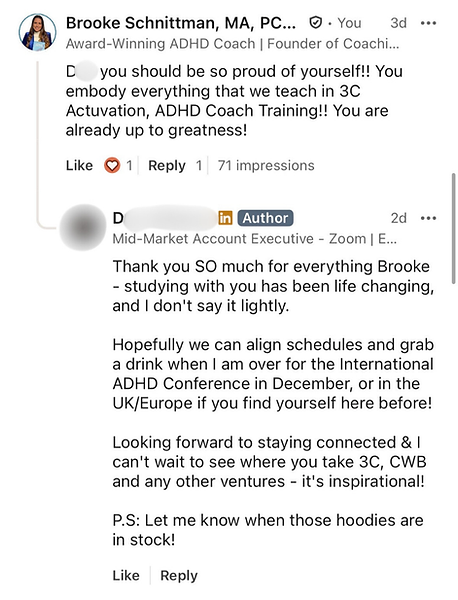 Upon completion of all requirements for 3C Activation® ADHD Coach Certification, you will receive your 3C Activation® Certified ADHD Professional Coach Badge for use on your website and certificate.